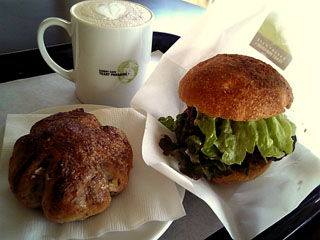 今回はセルフサービスコーナーでベーカリーコーナーで選んだくるみのパンとカウンターのメニュー表からフレッシュバーガーとカフェラテをオーダー。