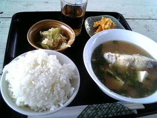 今日のお昼は糸満おさかなセンターで糸満漁協婦人部が営むお店で魚汁定食500円。ブツ切りのお魚は新鮮、いいダシが出てます。