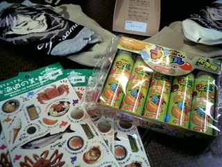 けつバンド(仮名)の練習の時、ギターのチョモ君がお土産を持ってきた。年末に行った釜山土産の「ヨン様靴下」と「唐辛子入りチョコ」に北海道出張土産の「マーブルチョコメロン味」に「北海道の美味シール」