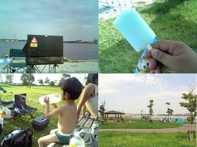 アイスで身体を中から冷やし、日もかげり始めてやっと皆の釣りモードにスイッチが入ってきた。てか遅すぎ(笑)。その頃にはエサの石ゴカイは予想通り暑さで超グロッキー。かわりにマチャ君が用意してきたワーム(ゴム製の疑似餌)に変えるとこれが大正解!生エサより反応がいい!初めて釣りをする女の子もみんなハゼを釣ることが出来て一安心。その中の一人は途中からは名人の風格も・・・(笑)