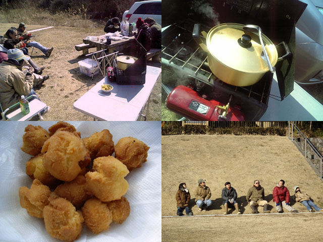 今回のメインメニューは今流行のカレー鍋。前夜、自宅で仕込んでおいた材料を鍋に投入しお鍋でグツグツ。スープは市販のカレー鍋の素を使ったんだけど更に風味を出す為にちょっとだけガラムマサラを追加。寒かっただけにスパイシーなカレー鍋はカラダが温まって美味しかったです。締めはうどんを投入し溶き卵を流し入れカレーうどんに。サイドメニューはスタメン君が持ってきた激ウマ焼豚のホイル焼きと、僕の大好物の沖縄料理「どぅる天」。「どぅる天」は前日、栄の沖縄物産店「わしたショップ」で業務用の冷凍品を買ってきたのをサラダ油とラードを混ぜた油でカリっと揚げたんだけど外はカリっ、中はねっとりで超美味。このメニューは今後定番メニューに入るかも。デザートはもちろん沖縄風ドーナツ「サーターアンダギー」。気温の低さ&強風によって油温の調整がむずかしかったけど最後にはなんとかいつも通りのクオリティのを作ることができました。
