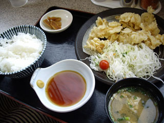 お盆の上にはごはん、みそ汁、漬け物に刻みキャベツと一緒にたっぷりのとりが盛られたお皿と天つゆがどーんと乗っている。とり天を一口食べる。衣はカリカリでサクサク。そして中の鶏肉はジューシー。とり天を味わっていると左手が勝手にごはん茶碗に行く(笑)ヤバいぐらいにごはんと良く合います。僕以外の3人の食べるとこ見てたらみんな僕と同じようにとり天を食べるとおもむろに茶碗を手にする(笑)、これ晩ご飯のおかずに最適です。皆さんもご家庭でお試しあれ。