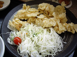 今から揚げるので少し時間がかかりますとのこと。作り置きを出されるぐらいならちょっと待ってでも揚げたてのほうがいいからもちろん文句なんで言いません。ワクワクしながら待っていると遂にとり天登場!さすがに今回は4人で1人前の定食を食べることに。