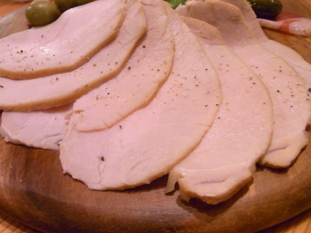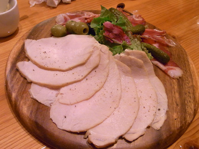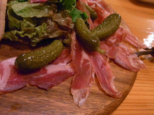 「自家製ハムとパルマ産肩肉のサラミ」お店の看板に「pork & Pizza 加藤食堂」と書いてあるだけあってこだわりがあるのだろう。自家製ハムのなんとウマいことか。盛りつけも美しい。