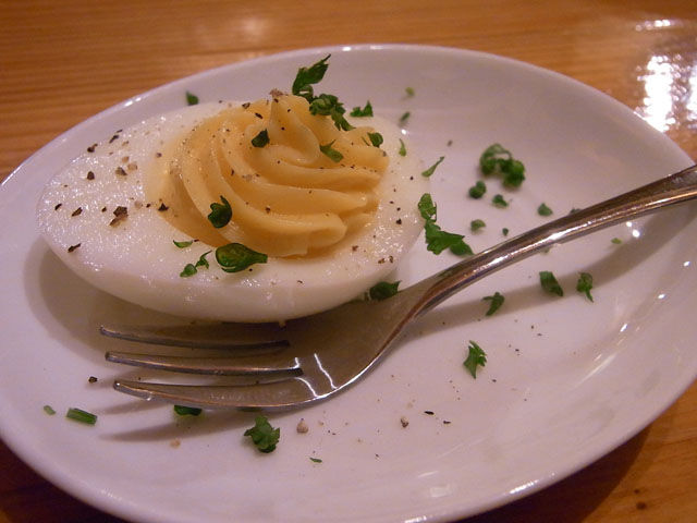 さて、まず口取り的に「自家製マヨネーズ」ゆで卵の白身の中にまろやかな優しい味の自家製のマヨネーズ