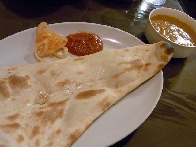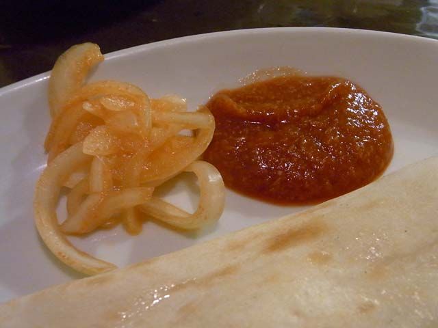 ナンのお皿には玉ねぎの酢漬けみたいなものとトマトソースのような甘酸っぱいソースが添えられている。このソースだけでナンを食べてもいい感じです。