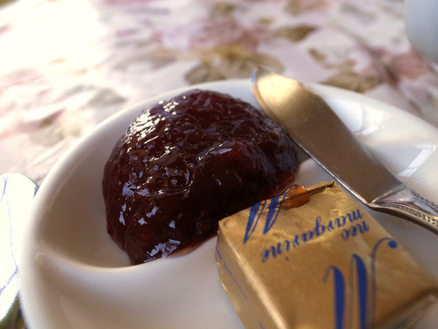 トーストにはジャムとバター。毎度のことながら花柄のテーブルクロスや壁紙が可愛い。