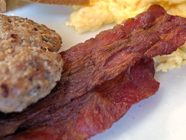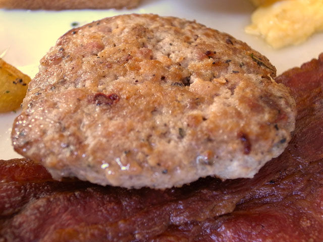 トッピングはカリカリに焼いたベーコンと自家製のカントリーソーセージ。ソーセージは自らのハーブガーデンで育てた無農薬のハーブをふんだんに使っていて美味。