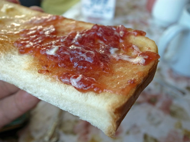 ボクは「マリアおばちゃんのカントリーブレックファースト」をオーダー。卵2個、厚くスライスしたトーストかイングリッシュマフィンにホットコーヒーがセットになっている。ボクはパンは厚切りトーストにして、卵はスクランブルエッグにしてもらった。キツネ色の焼き色のついたトーストが美味しそう。