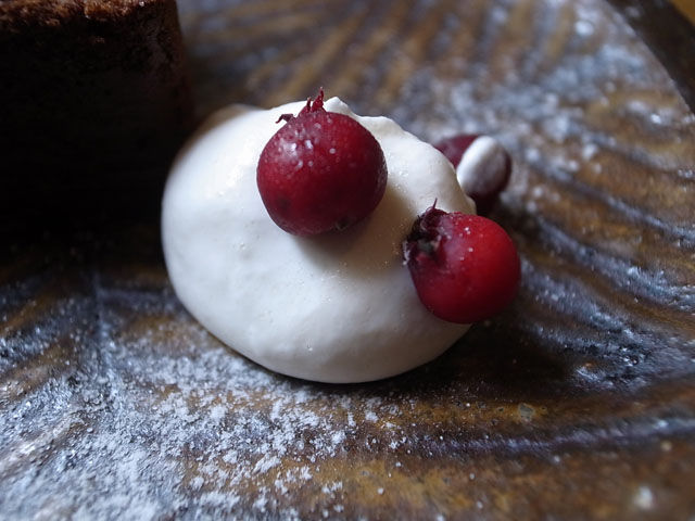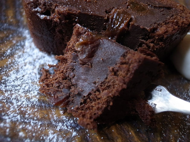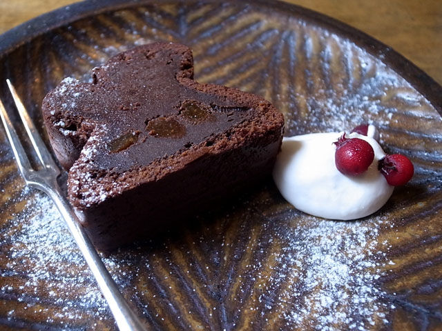 濃厚でビターなガトーショコラがラムレーズンと良く合う。甘さも控えめで美味。