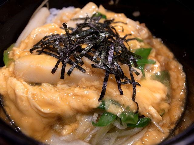 大きめに切られた京かまぼこにふわふわの卵。たっぷり葱にしゃきしゃき感に天かすの香ばしさ。色々な食感を楽しむことができる。
