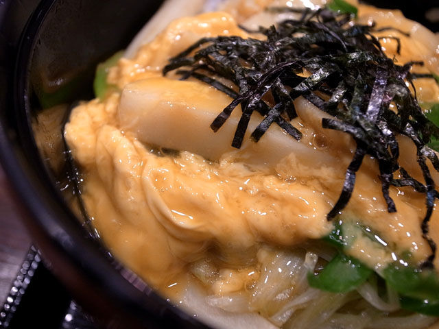 関西の食堂ではわりとポピュラーなかまぼこを卵とじにした丼物「木の葉丼」。それにたっぷりの葱と天かすを乗せたのが有喜屋のオリジナルメニュー「来葉丼」