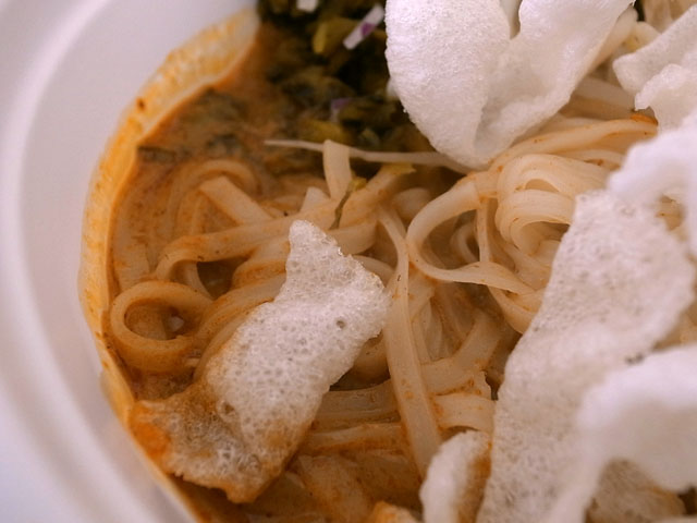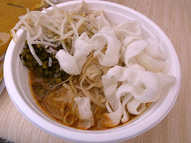カオソーイは米麺に鶏肉、高菜、もやし、そして揚げ麺。