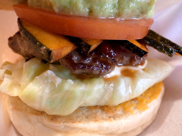 アボの下にスライストマト、グリルパンプキン、パティ、オニオン、レタスの順で挟まれる。ソースはBBQソースにマヨ、マスタード。詰まった弾力のあるパティとパンプキンの相性が予想以上にいい。