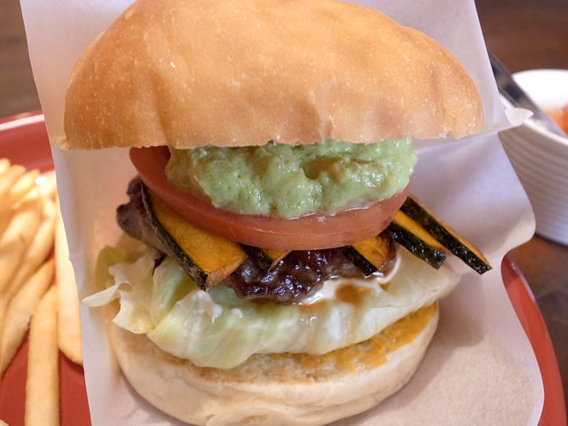 メニューの写真ではスライスしたアボカドが挟んであったが最近仕様変更があったのか今日だけのことなのか運ばれてきたバーガーのはディップ状のアボカド。