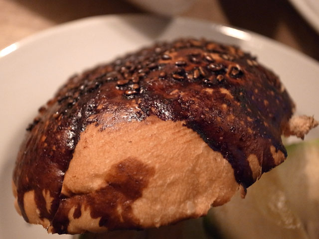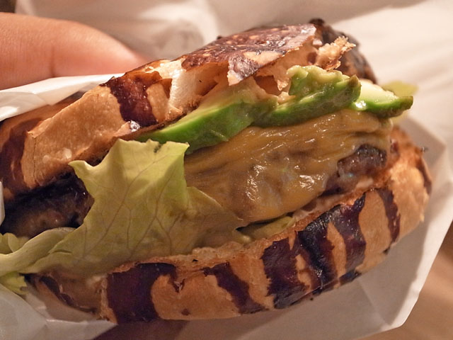 見た目にもインパクトのあるこのバンズ。カラメルをかけて焼いてあるとのこと。バンズの表面のカラメルのかかったところのパリパリとした食感が楽しい。