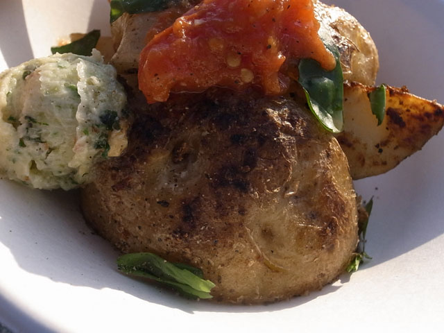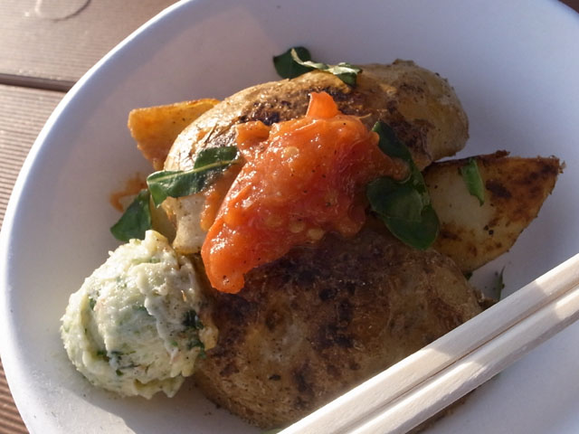 皮ごとこんがりと焼かれた大きな新じゃがいもがゴロゴロ。皮はパリっと、中はホクホク。上には爽やかな酸味のトマトソース。その脇のボール状のものはバジルの風味のディップ?