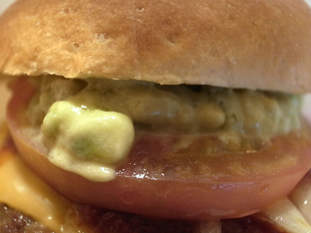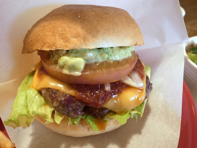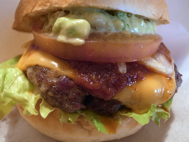下からレタス、ビーフパティ、チーズ、BBQソース、オニオン、トマト、アボカド。