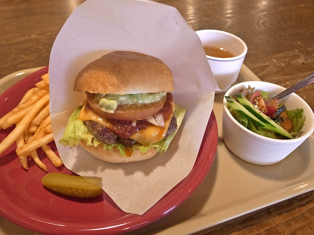 アボカドバーガーをランチセットでオーダー。そこにスタンプラリー特典でチーズを追加トッピング
