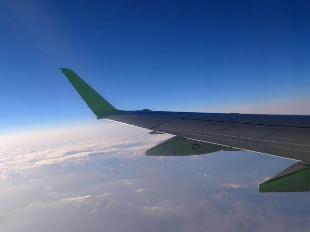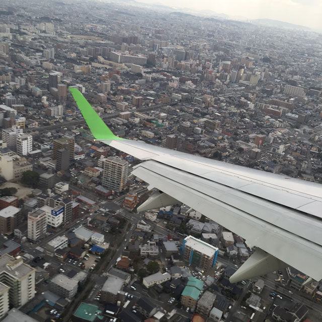 朝日を浴びながら県営名古屋空港を離陸し一時間ちょっとのフライトで福岡に到着。