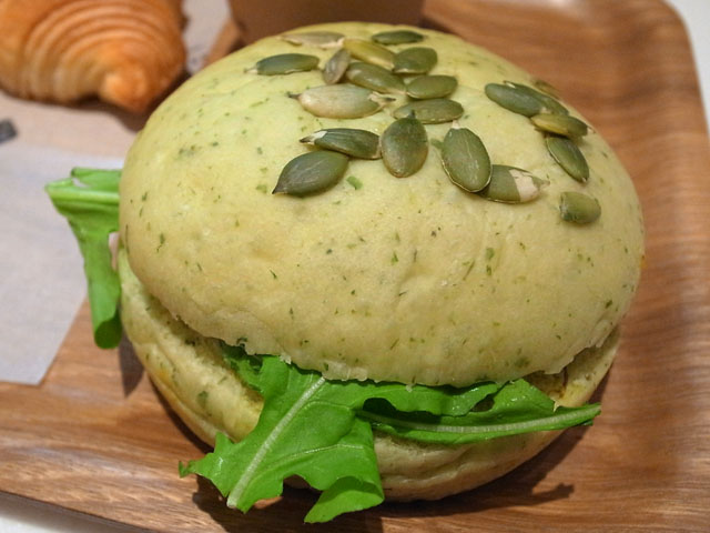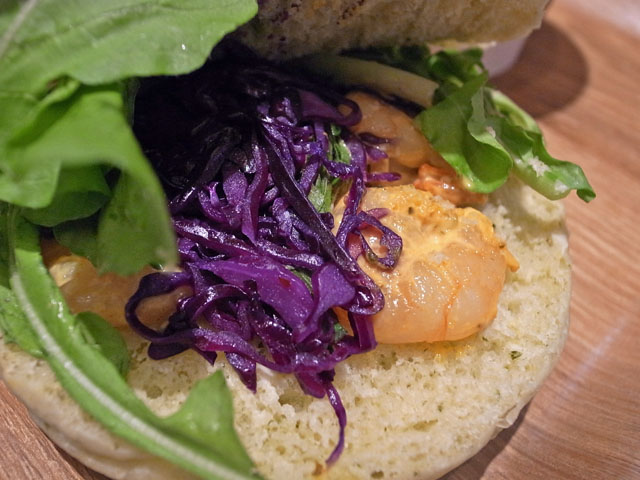 ルッコラバンズ。ルッコラの練りこまれたバンズに紫キャベツ、ルッコラ、エビのカレーマヨ和えが挟まれている。これ美味しかったなぁ。