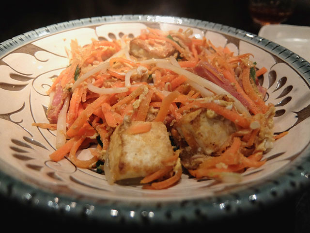 この日のつきだしはゴーヤサラダ。最初のオーダーはもずくそーめんにジーマミー豆腐の揚げ出し