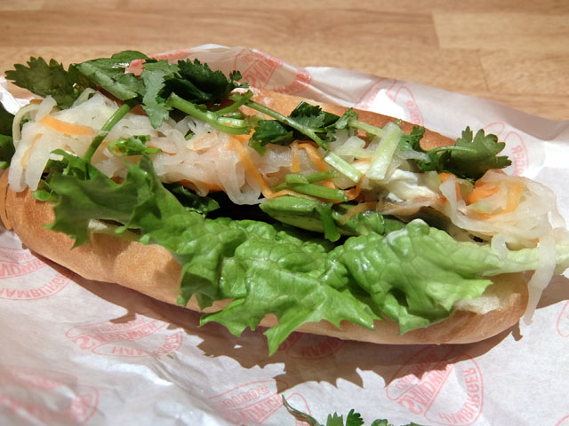 バインミー、写真ではあまり目立たないけどレタスとなますの間にはアボカドとチーズがたっぷり挟まれている。