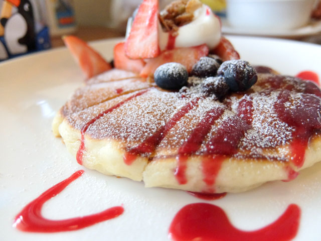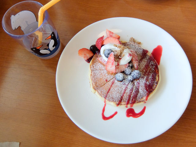 そして息子はいつものベリーパンケーキ。嬉しいことに息子用に最初からカットして提供してくれました。ありがとうございます。