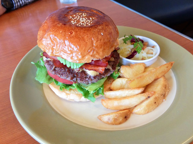レタス、トマト、ビーフパティ、チーズ、グリルオニオン、ベーコン、アボカド。バンズはふんわり、さっくり。アボカドのきれいなカットにテンションがあがる。ビーフパティも絶品!