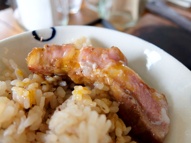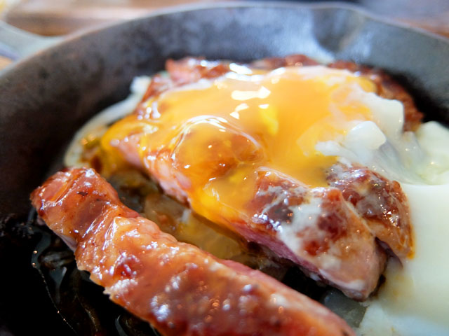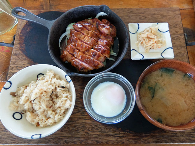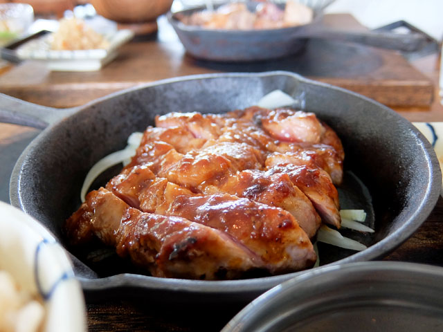 照り焼き風に焼かれた県産豚ステーキに別添えの温玉をからめていただきます。