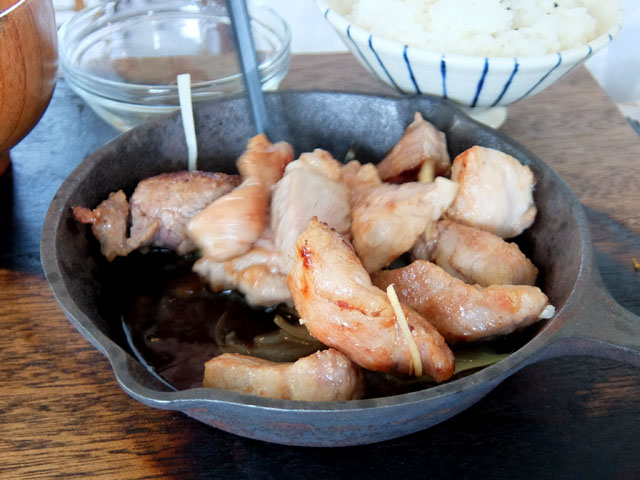 ヨメさんの頼んだ生姜焼き定食、スライスした豚肉を想像していたら大きめにカットされたお肉がごろごろ