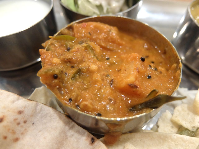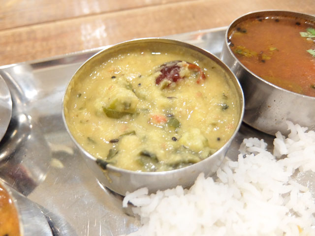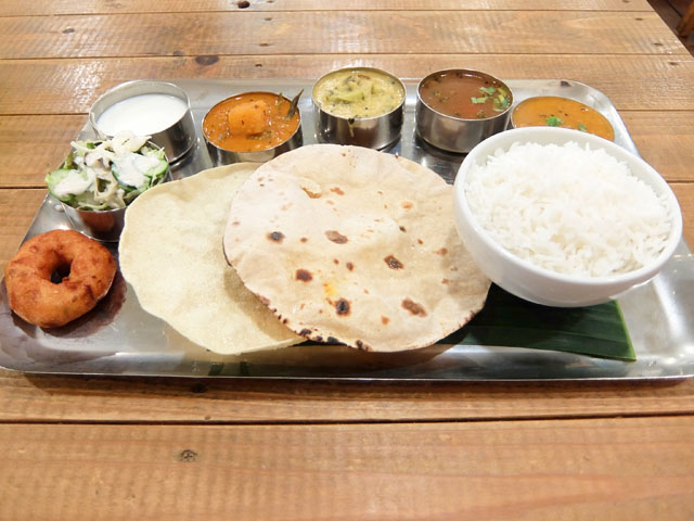 入店したのはラストオーダー時間直前。べジターリーをオーダー。ベジカレー2種にサンバル、ラッサム、サラダ、スナック、デザート、ラッシーなどが付いたセット。