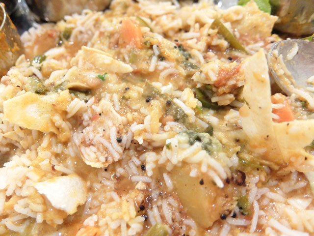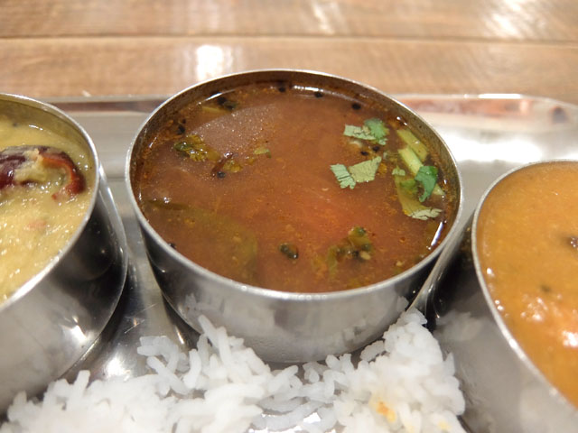 プーリーを砕きつつライスをプレートにドバっと広げ、カレーやラッサムも全部ぶちまけて混ぜ混ぜしながら食べるのが醍醐味。