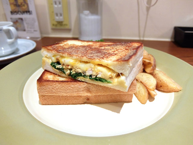 ヨメさんのグリルチーズサンドはカレーチキンとほうれん草のグリルチーズサンド。ひとかじりさせてもらったけど美味しいかったなぁ。