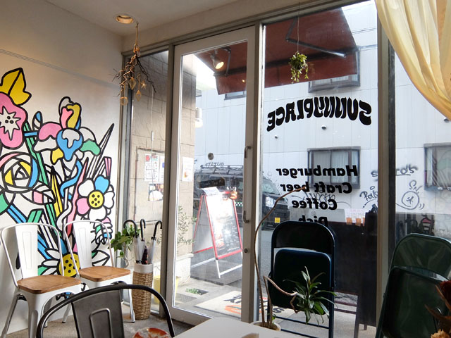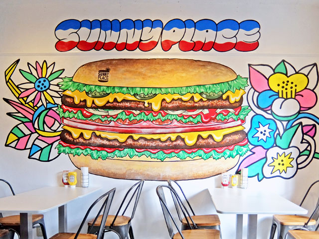 店内の壁に大きくペイントされたハンバーガーのポップなイラストがバーガーが焼き上がるまでの時間を更にワクワクした時間にさせてくれる。