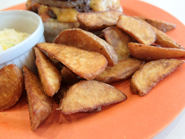 肉々しい粗挽きのビーフパティにたっぷりチェダーチーズ、グリルドオニオンに厚切りトマト。パティの下にはザワークラウトが隠れている。