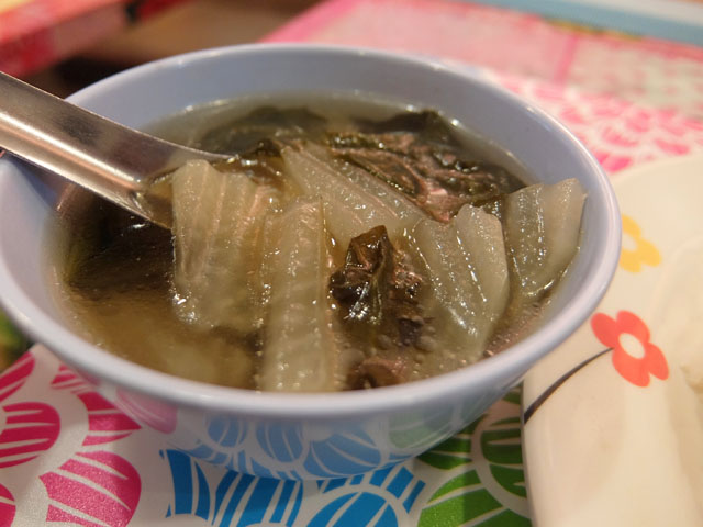 まずはスープ。フライパンで具材を炒める軽快な音を聞きながらスープを飲む。
