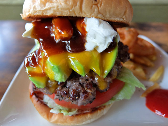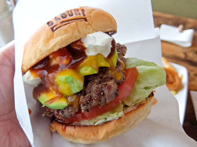 オーダーはアボカドチーズバーガーのサワークリームトッピング。ソースがプレーン、BBQ、てりやき、レッドホット、スイートチリ、ハニーマスタードから選べるとのことでBBQソースに。