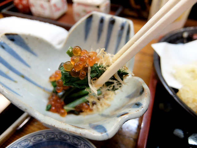 運ばれてきたしどけのお浸し。しどけだけだと思ってたらイクラまで乗っていて見た目的にも美しい。