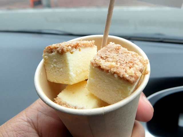 小さなカップにダイス状にカットされたアイスチーズケーキがごろごろ。食べ歩きスイーツとしても人気出そう。