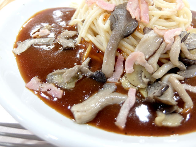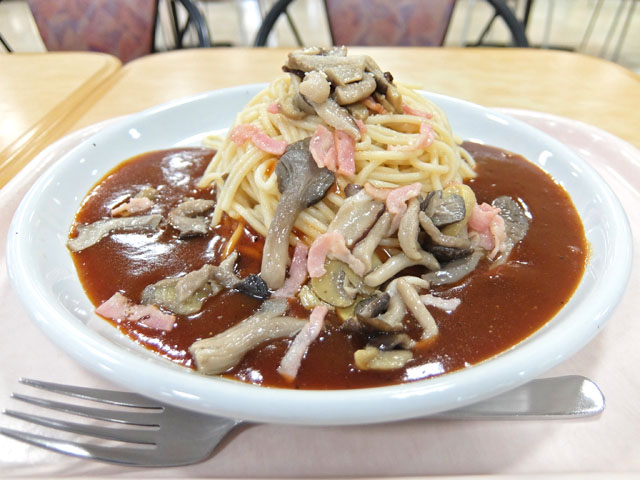季節メニューなのかな?通常メニューとは別にメッセージボードに「きのこスパ」という張り紙があったのでそいつをオーダー。麺の量は普通(300g)で。