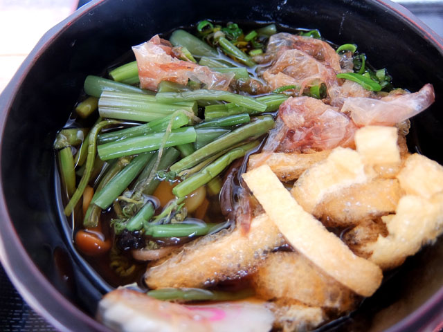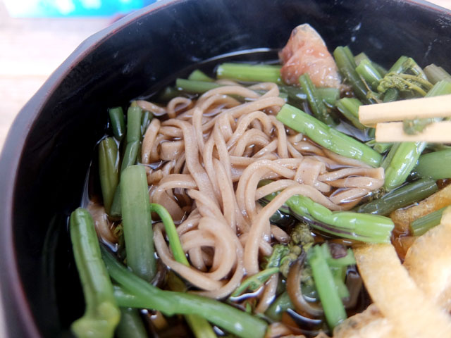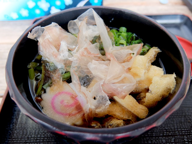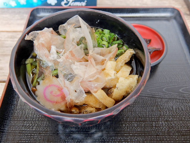 素朴な雰囲気の田舎蕎麦に山菜、ナルト、油揚げ、花かつお。