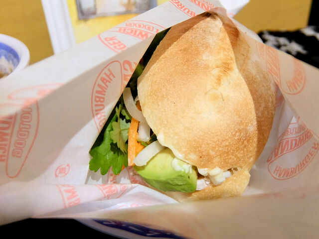 この日の気まぐれバインミーは自家製サラダチキンとフムスのバインミー。そこにアボカドをトッピング。
