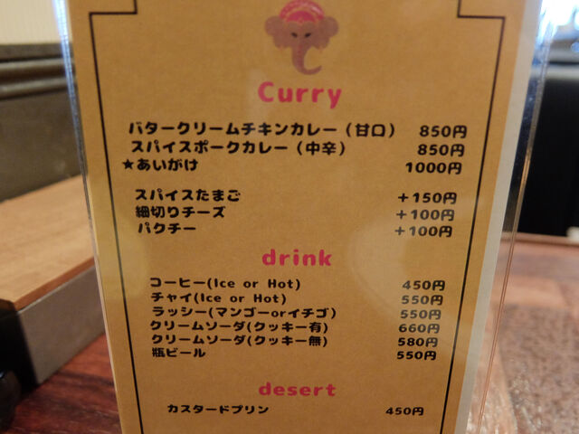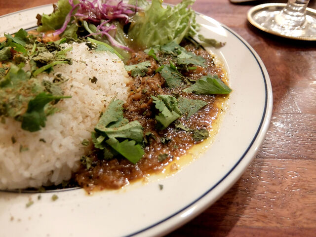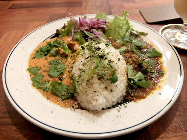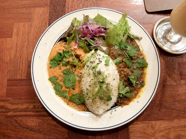 オーダーしたのはバタークリームチキンカレーとスパイスポークカレーのあいがけをライス少なめパクチートッピングで。本当はスパイスたまごもトッピングしたかったんだけどこちらは売り切れでありつけず。