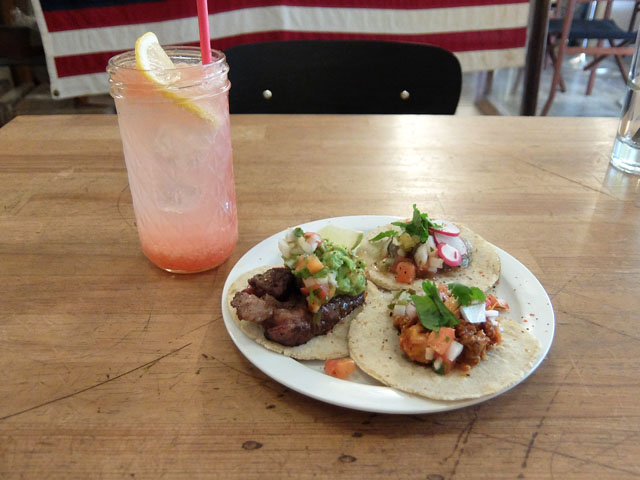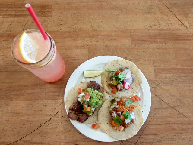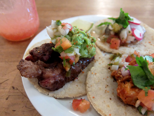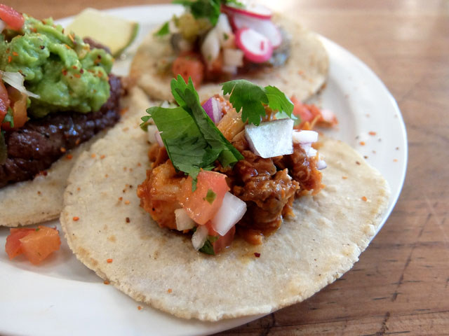 ビーフにワカモレが乗っかったのやらタコミートの乗ったのやら。コーントルティーヤから作った本格派なタコス。