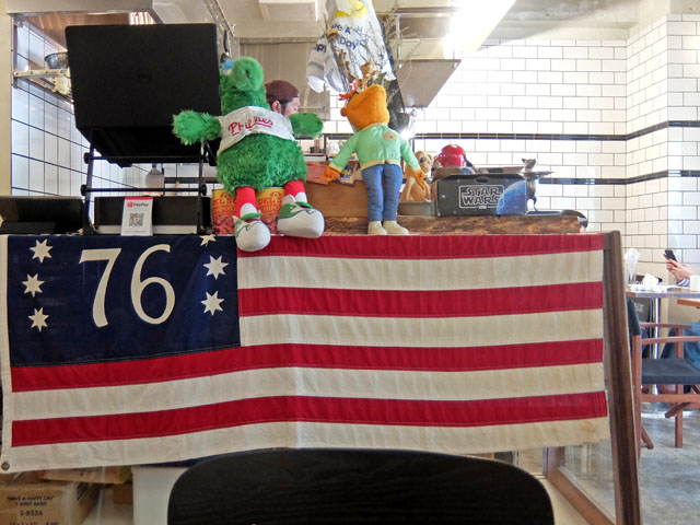 カウンターにはレトロなアメリカ国旗と大リーグ「フィリーズ」のマスコットキャラクター「フィリー・ファナティック」が飾られている。