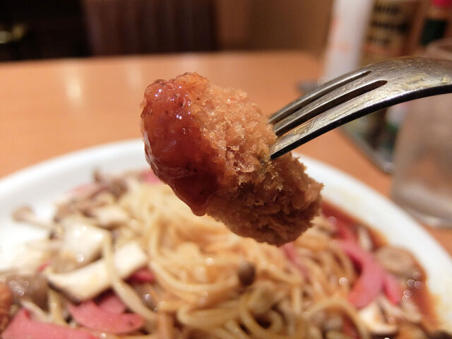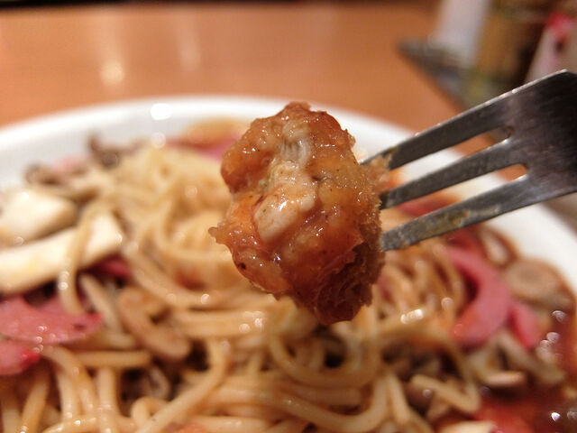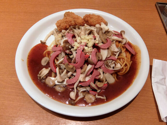毎年シーズンになると1回は必ず食べるカキフライのあんかけスパ、そういえば今シーズンはまだだったな、ということでこの日のオーダーは数種類のきのこ類と赤ウインナーのソテーが乗った「フンギ」のレギュラーサイズ(ゆで麺330g)に季節限定で1個単位でトッピングできるカキフライを3個トッピング。