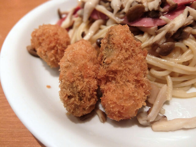 チャオのカキフライ、たぶん冷凍ものなのかな?粒は小さめだし衣が厚めでガリガリなんだけどこれにチャオの特製あんを塗りたくって食べるとウマいんだわ。