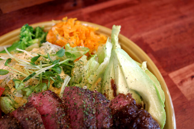柔らかな国産ランプ肉のステーキにモリモリな野菜、そしてアボカド