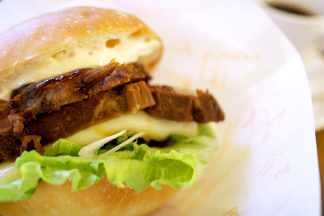 カイザーパンに挟まれている具材はレタスに長ネギ、マヨ、そして江南チャーシュー。オニオンのかわりにスライスした長ネギを挟むあたりがなかなかセンスがいいと思うな。